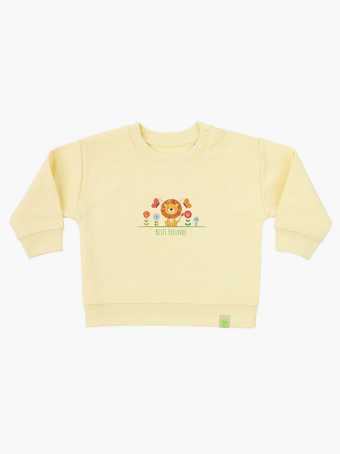 Der freundliche Löwe und die Aufschrift „Beste Freunde“ geben diesem nachhaltigen Pullover für Babys einen besonders fröhlichen Look.