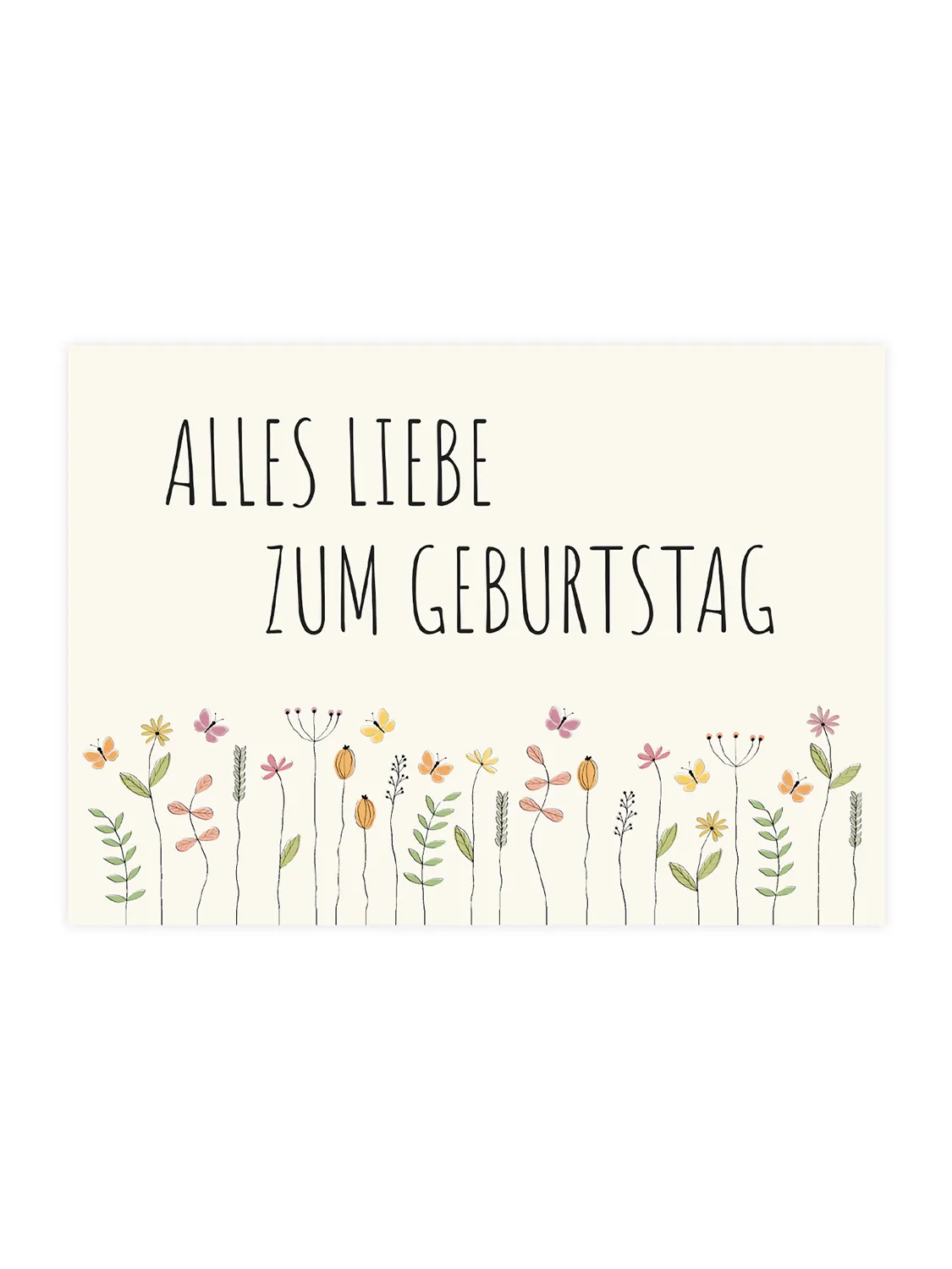 Auf der Suche nach einer originellen Geburtstagskarte? Diese Klappkarte überzeugt durch ihr verspieltes Blumenmotiv und der Aufschrift “Alles Liebe zum Geburtstag”.