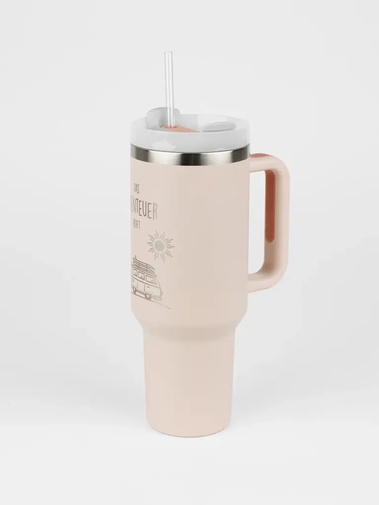 Das lässige Van-Motiv und der Spruch „Das Abenteuer ruft“ machen diesen stylischen Isolierbecher zum perfekten Begleiter für unterwegs. Dank Trinkhalm und Henkel ist der roséfarbene Becher besonders praktisch.