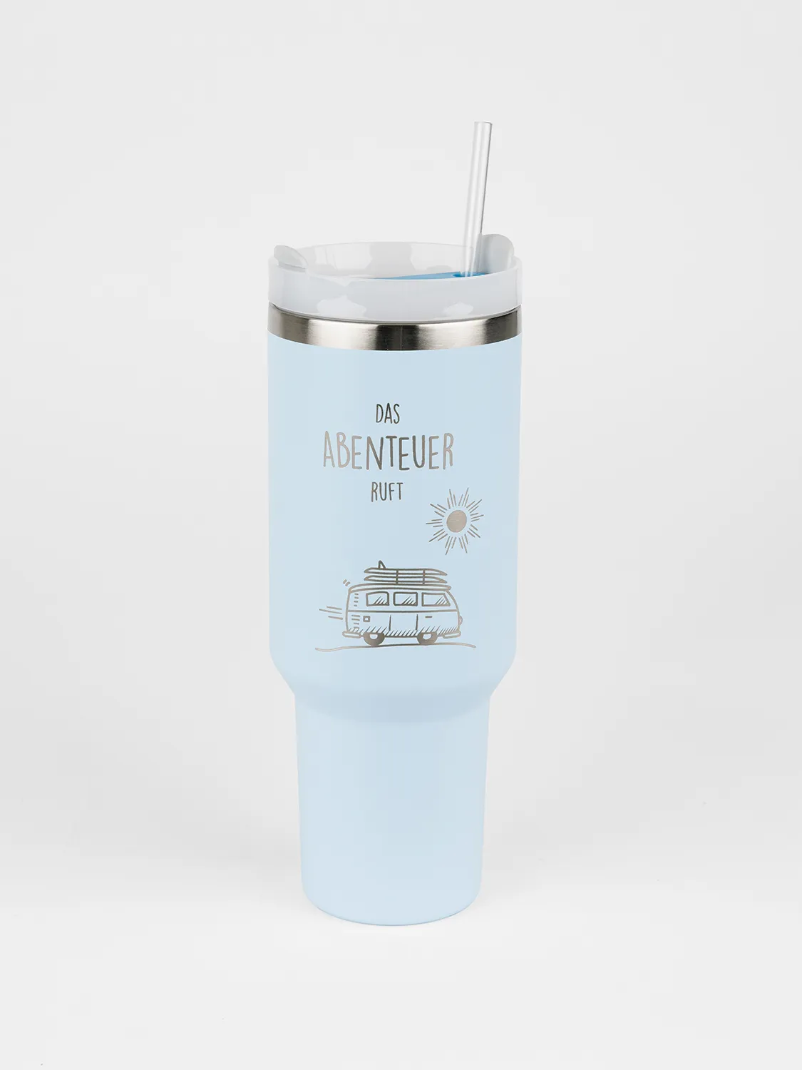 Das lässige Van-Motiv und der Spruch „Das Abenteuer ruft“ machen diesen stylischen Isolierbecher zum perfekten Begleiter für unterwegs. Dank Trinkhalm und Henkel ist der blaue Becher besonders praktisch.
