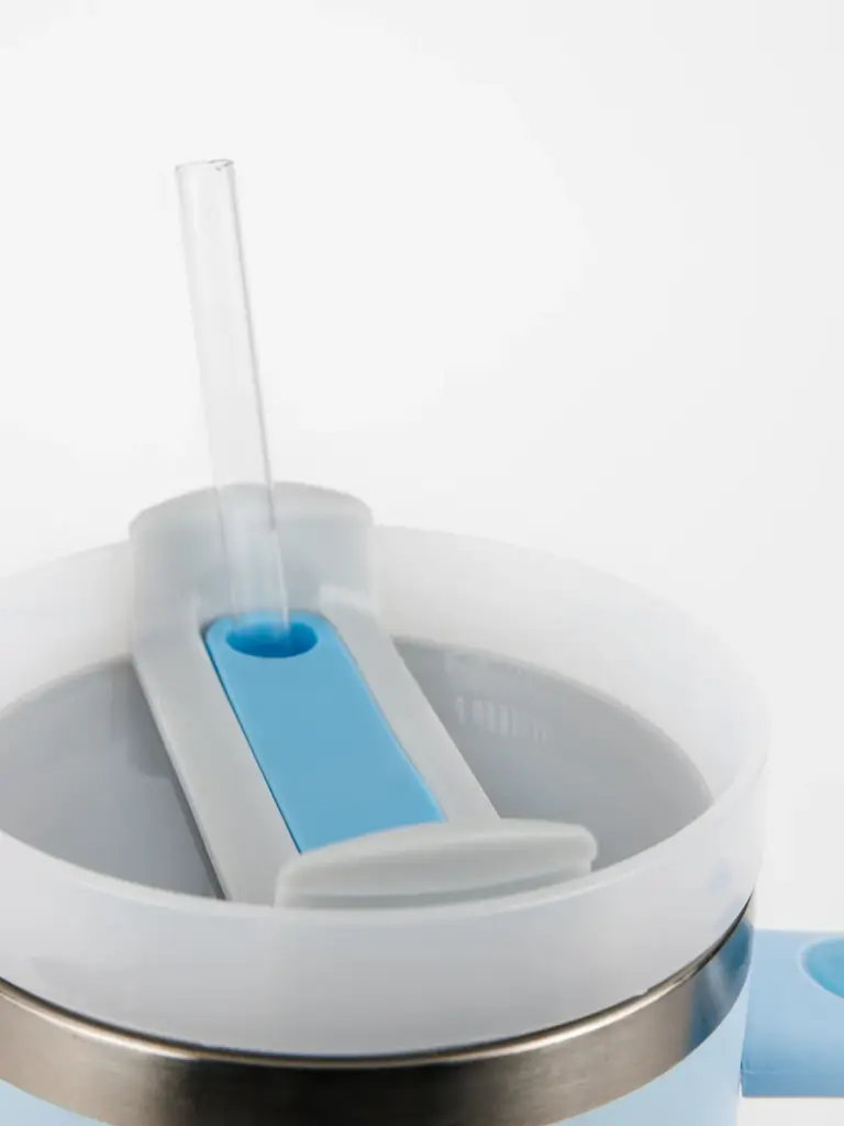 Eigenschaften: Edelstahl, isolierend, mit Deckel und Trinkhalm, praktischer Henkel