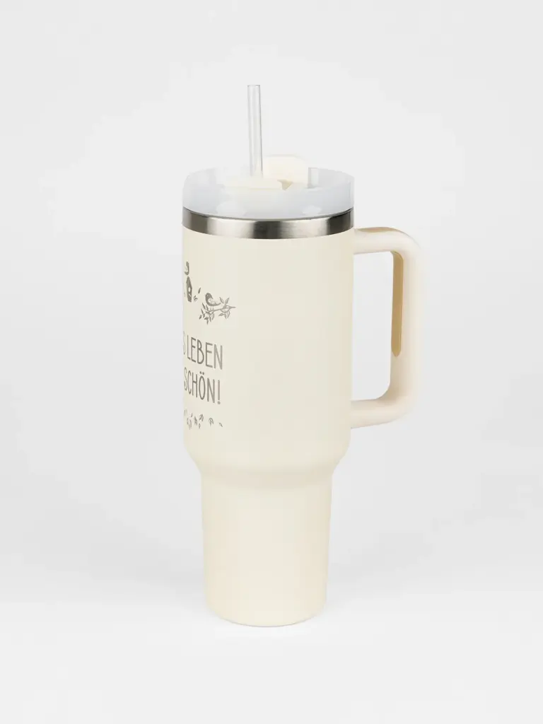 Dank verspieltem Motiv und dem Spruch „Das Leben ist schön“ sorgt dieser stylische Isolierbecher für eine glückliche Stimmung. Trinkhalm und Henkel machen den cremefarbenen Becher besonders praktisch.