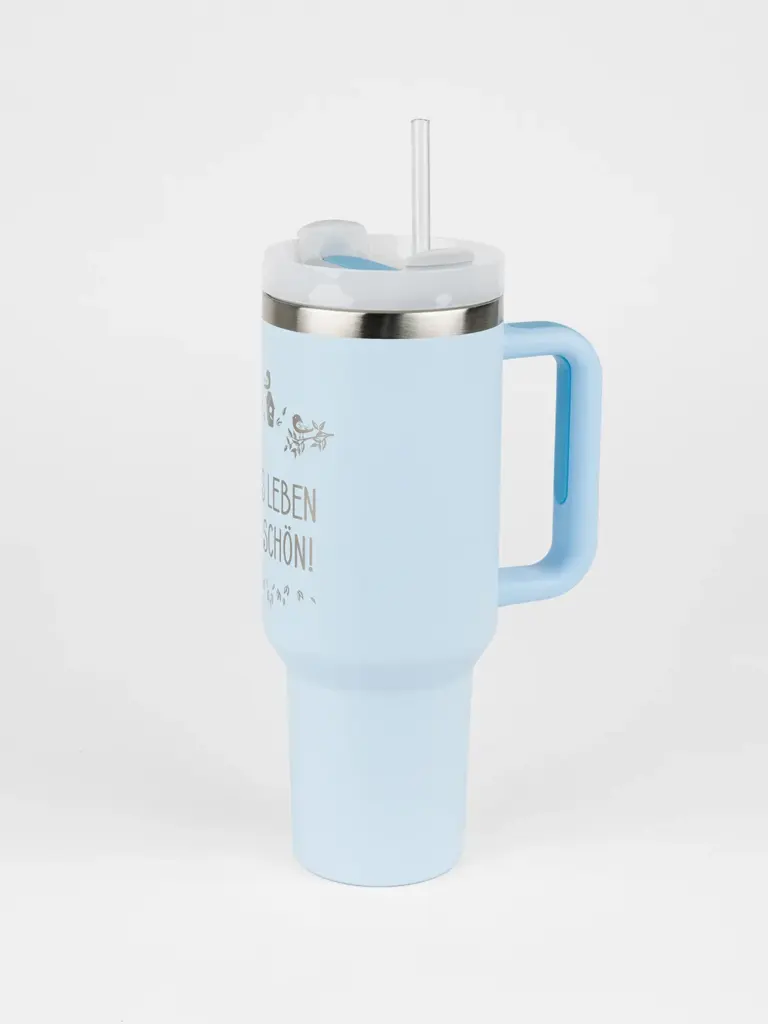 Dank verspieltem Motiv und dem Spruch „Das Leben ist schön“ sorgt dieser stylische Isolierbecher für eine glückliche Stimmung. Trinkhalm und Henkel machen den blauen Becher besonders praktisch.