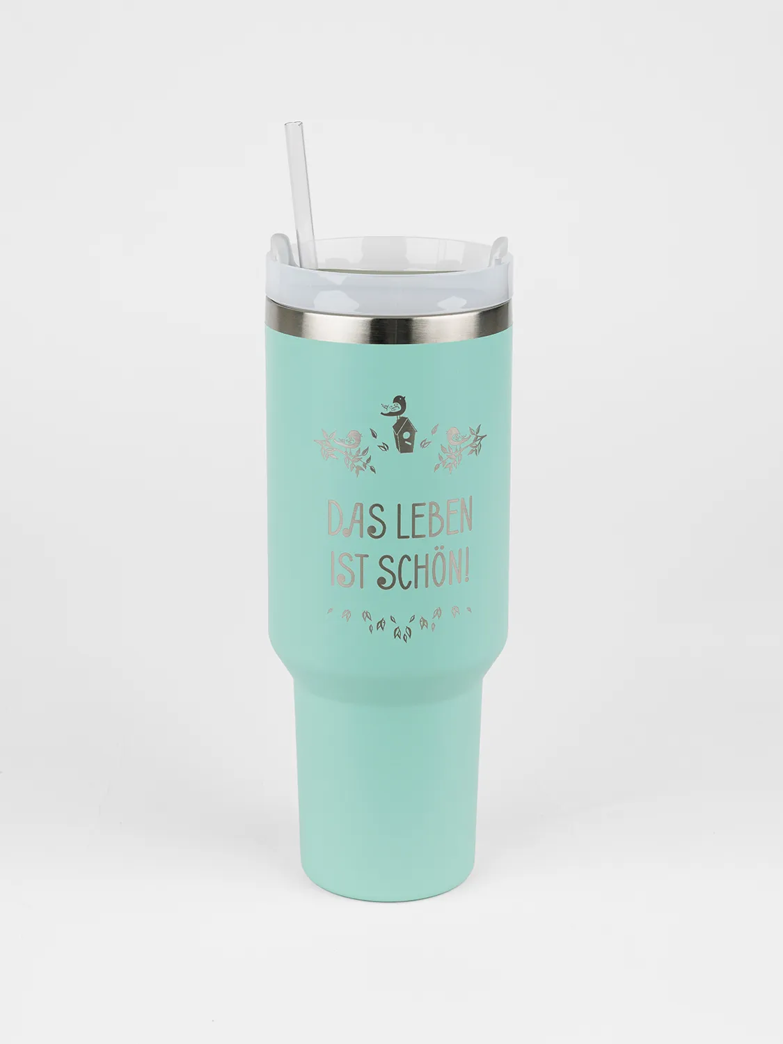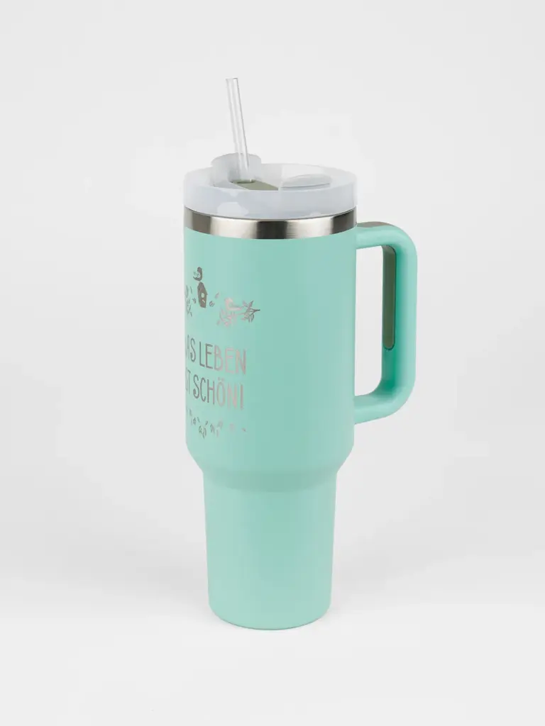 Dank verspieltem Motiv und dem Spruch „Das Leben ist schön“ sorgt dieser stylische Isolierbecher für eine glückliche Stimmung. Trinkhalm und Henkel machen den mintfarbenen Becher besonders praktisch.
