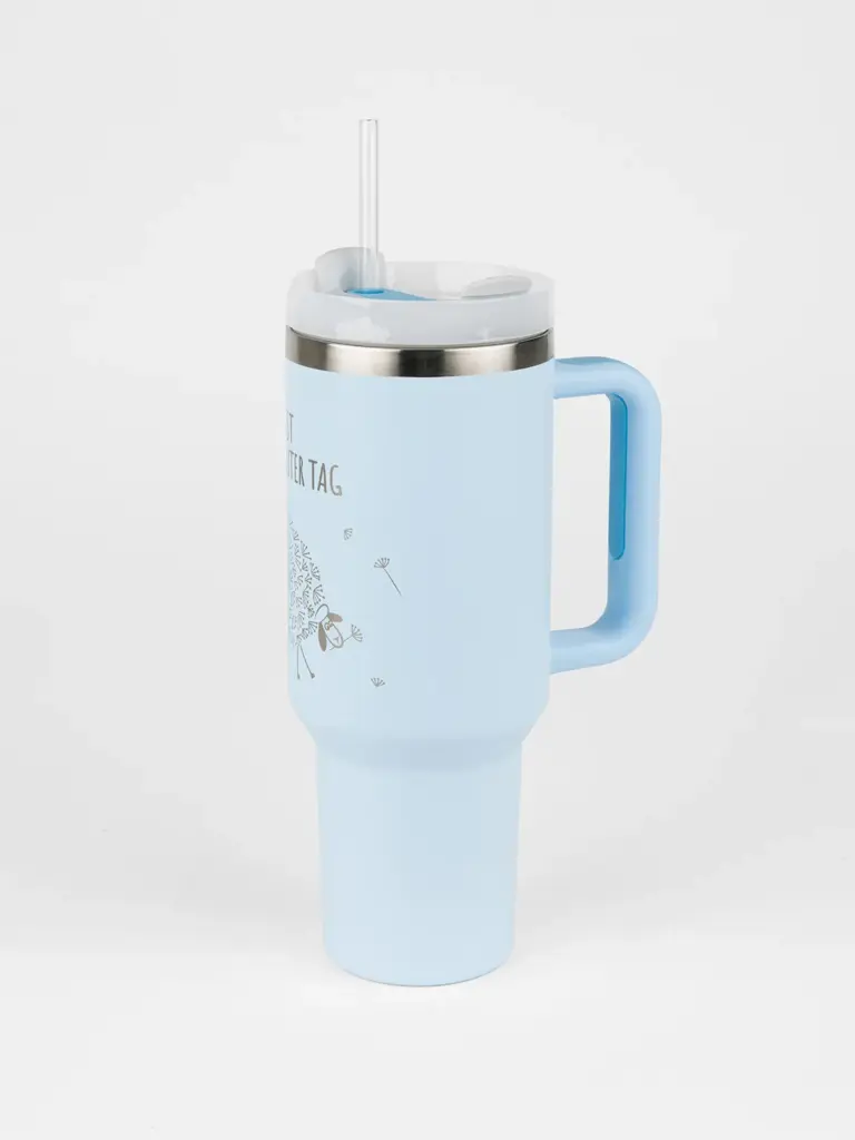 Dank der inspirierenden Aufschrift „Heute ist ein guter Tag“ und einem süßen Schaf, ist dieser Isolierbecher ein stilvoller Begleiter für unterwegs. Trinkhalm und Henkel machen den blauen Becher besonders praktisch.