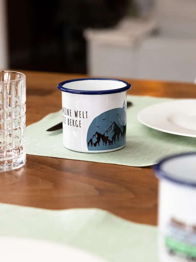 Emailletasse mit Bergmotiv