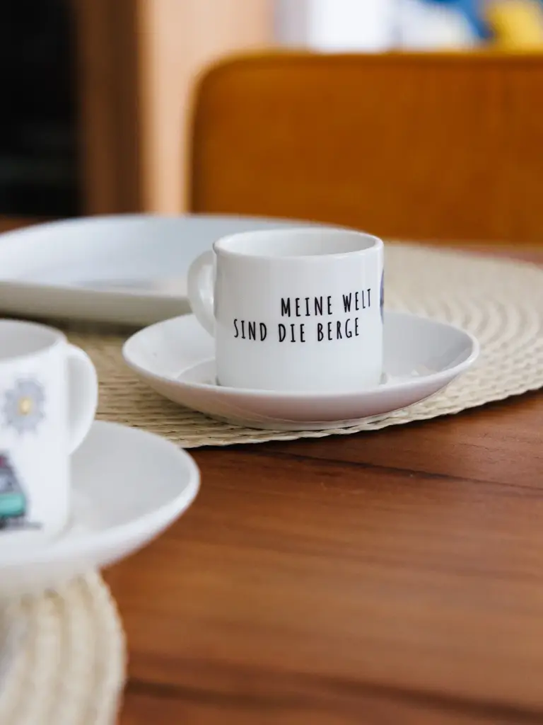 Durch den Aufdruck „Meine Welt sind die Berge“ sorgt diese Espressotasse aus Keramik für besondere Genuss-Momente.