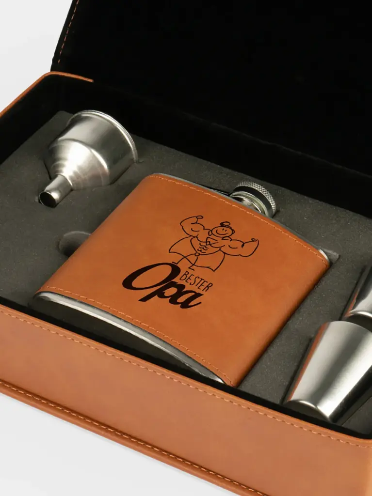 Das Geschenkset besteht aus einem gravierten Flachmann mit Kunstlederbeschichtung, zwei passenden Schnapsbechern, einem praktischen Trichter und einem edlen Etui mit Kunstlederbezug. Damit ist es nicht nur ein schönes Präsent, sondern auch ein nützliches Accessoire für besondere Momente – ob beim Wandern, auf der Jagd oder beim gemütlichen Beisammensein.
