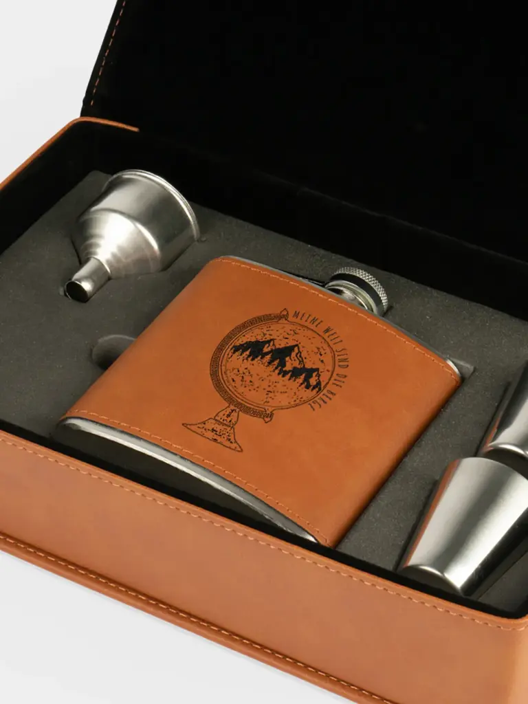 Das Geschenkset enthält einen gravierten Flachmann mit brauner Kunstlederbeschichtung, zwei Edelstahlbecher, einen passenden Trichter und ein robustes Etui. Ideal für den Rucksack, die Berghütte oder das Gipfelpicknick – und ein treuer Begleiter für alle, die sich in den Bergen zuhause fühlen.
