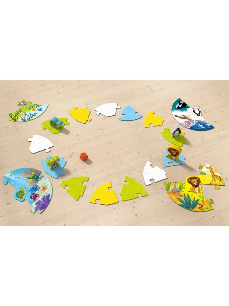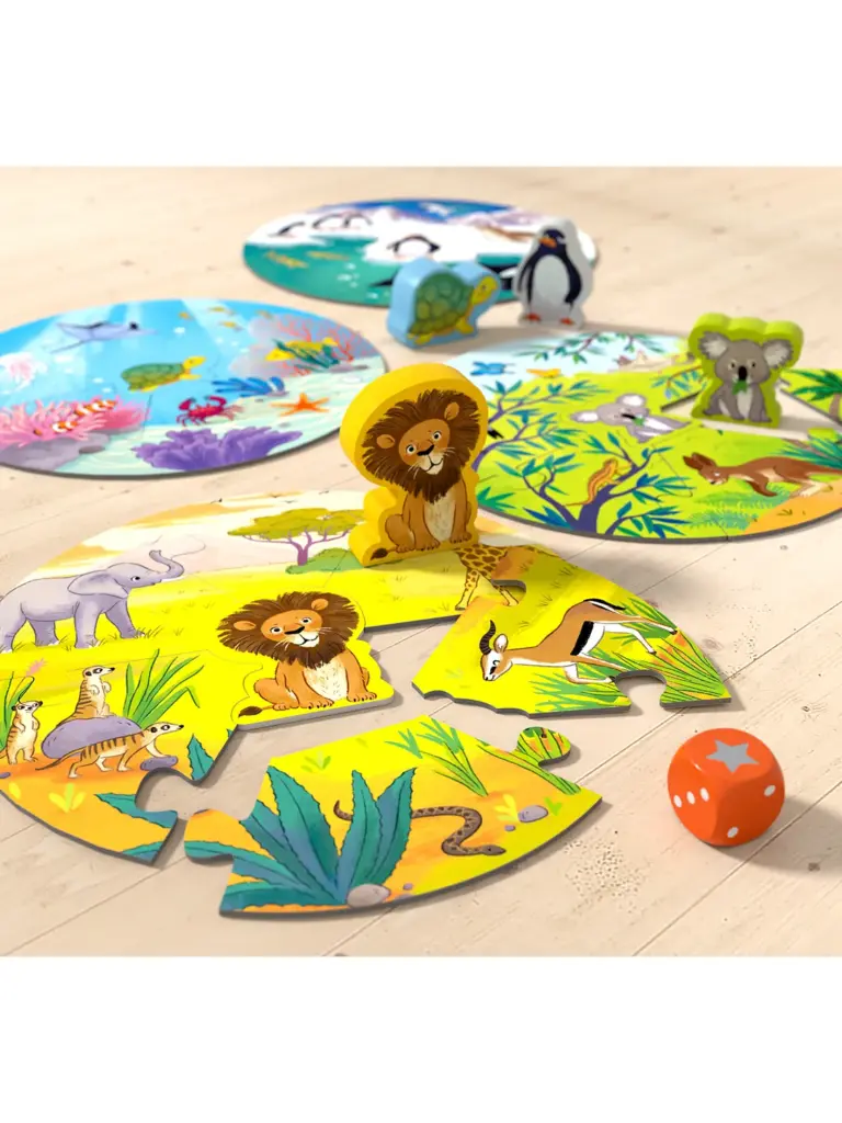 Oh oh, Löwe, Koala, Schildkröte und Pinguin haben sich verlaufen. Wer kann ihnen helfen? Die Kinder wählen ein Tier aus und schicken es mithilfe des Würfels auf eine „Rundreise“. Landet die Figur unterwegs auf einem farbig passenden Puzzleteil, darf das Kind sie nehmen. Wer das passende Zuhause des gewählten Tieres zuerst fertig puzzelt, gewinnt.