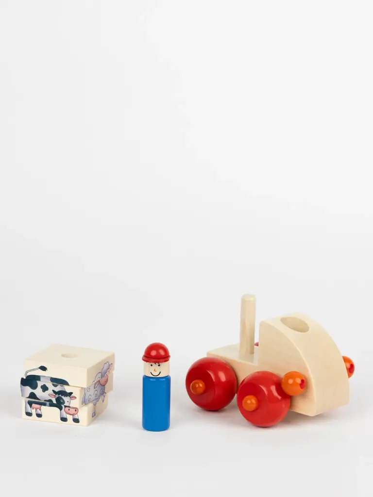 • Drei Holzbausteine zum Stapeln mit vier Motiven (Kuh, Henne, Schwein und Schaf)