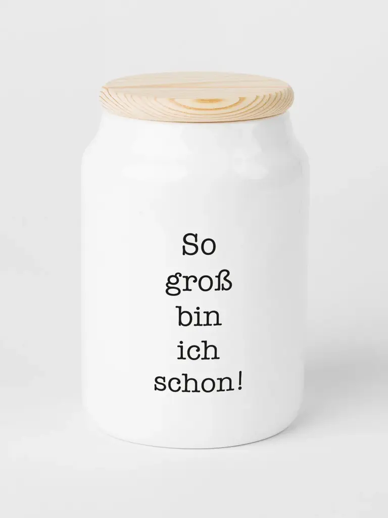 Ein verspieltes Motiv mit Giraffe und der Aufschrift „So groß bin ich schon“ macht diesen Keramikbehälter zum süßen Home-Accessoire. Ob in der Küche, im Esszimmer oder Badezimmer – das Vorratsgefäß ist dekorativ und praktisch zugleich. Der Deckel aus Holz ist mit einer Gummidichtung ausgestattet, sodass die Cookie Dose luftdicht verschlossen werden kann.