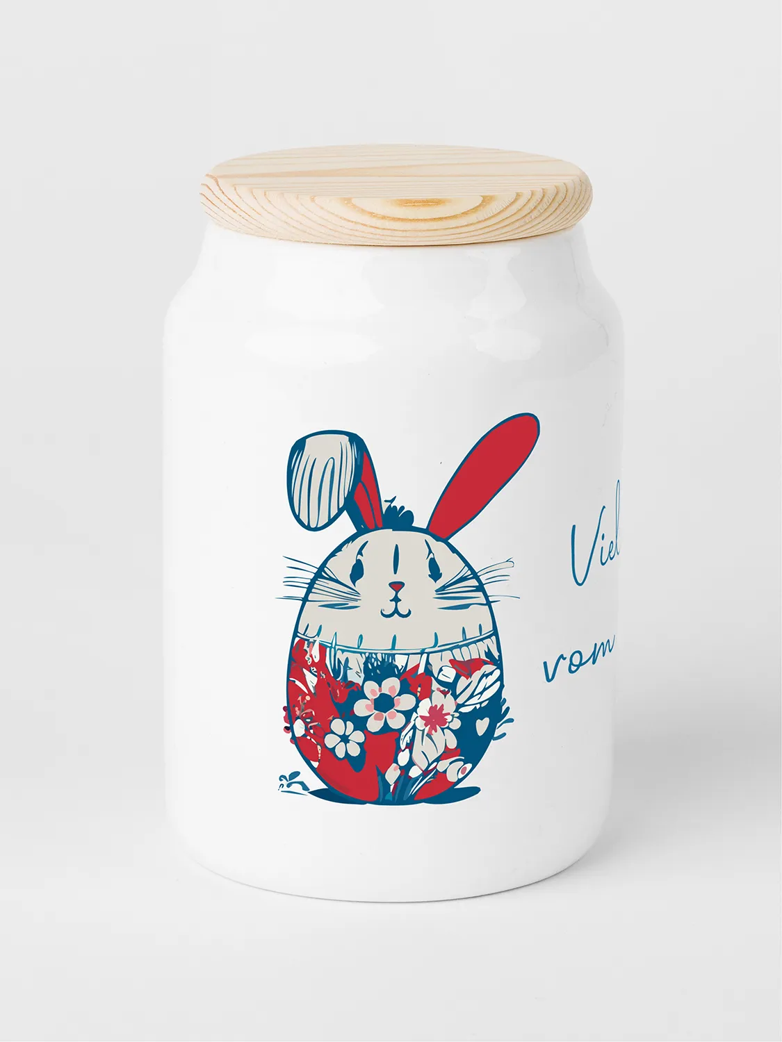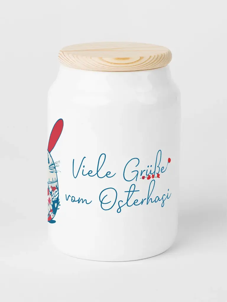 Das süße Ostermotiv mit der Aufschrift „Viele Grüße vom Osterhasi“ macht diesen Keramikbehälter zu einem großartigen Ostergeschenk. Ob in der Küche, im Esszimmer oder Badezimmer – das Vorratsgefäß ist dekorativ und praktisch zugleich. Der Deckel aus Holz ist mit einer Gummidichtung ausgestattet, sodass die Cookie Dose luftdicht verschlossen werden kann.