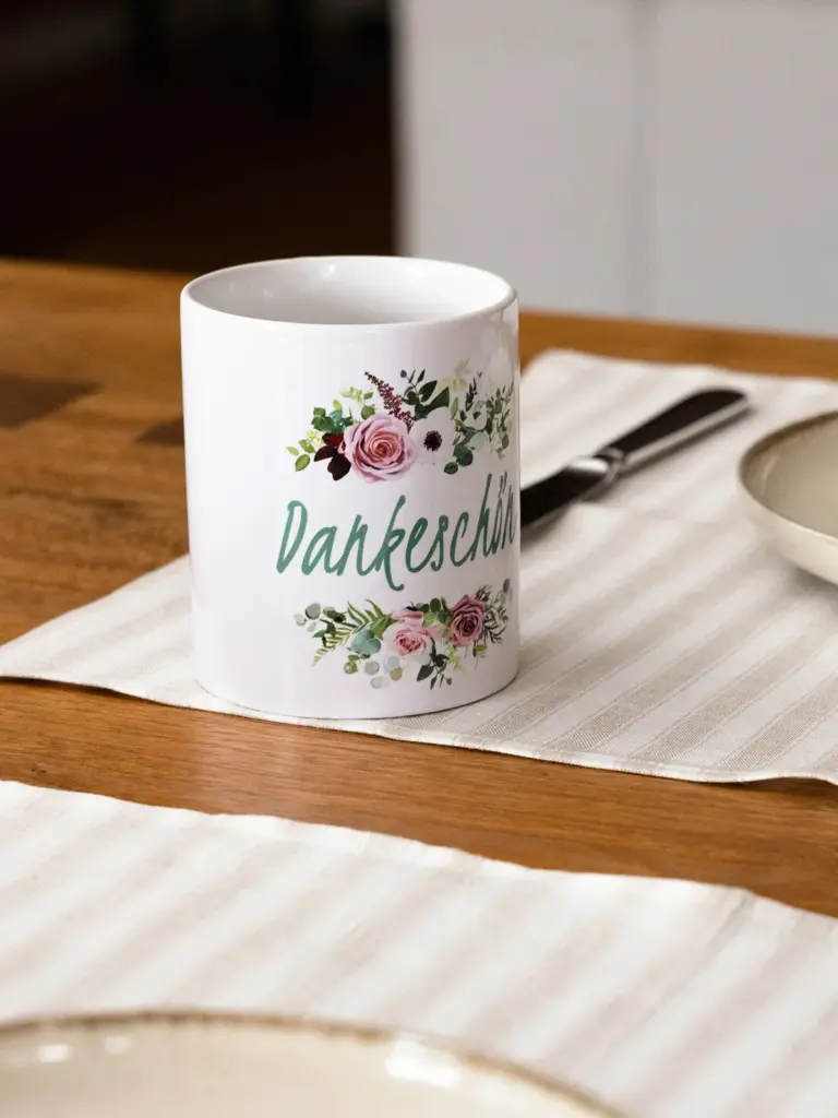 Durch das blumige Design mit der Aufschrift „Dankeschön“ eignet sich diese Tasse hervorragend als Geschenk.