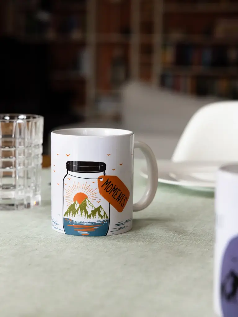 Ein verträumter Landschafts-Print mit der Aufschrift „Moments“ macht diese Tasse zu einem echten Lieblingsstück.