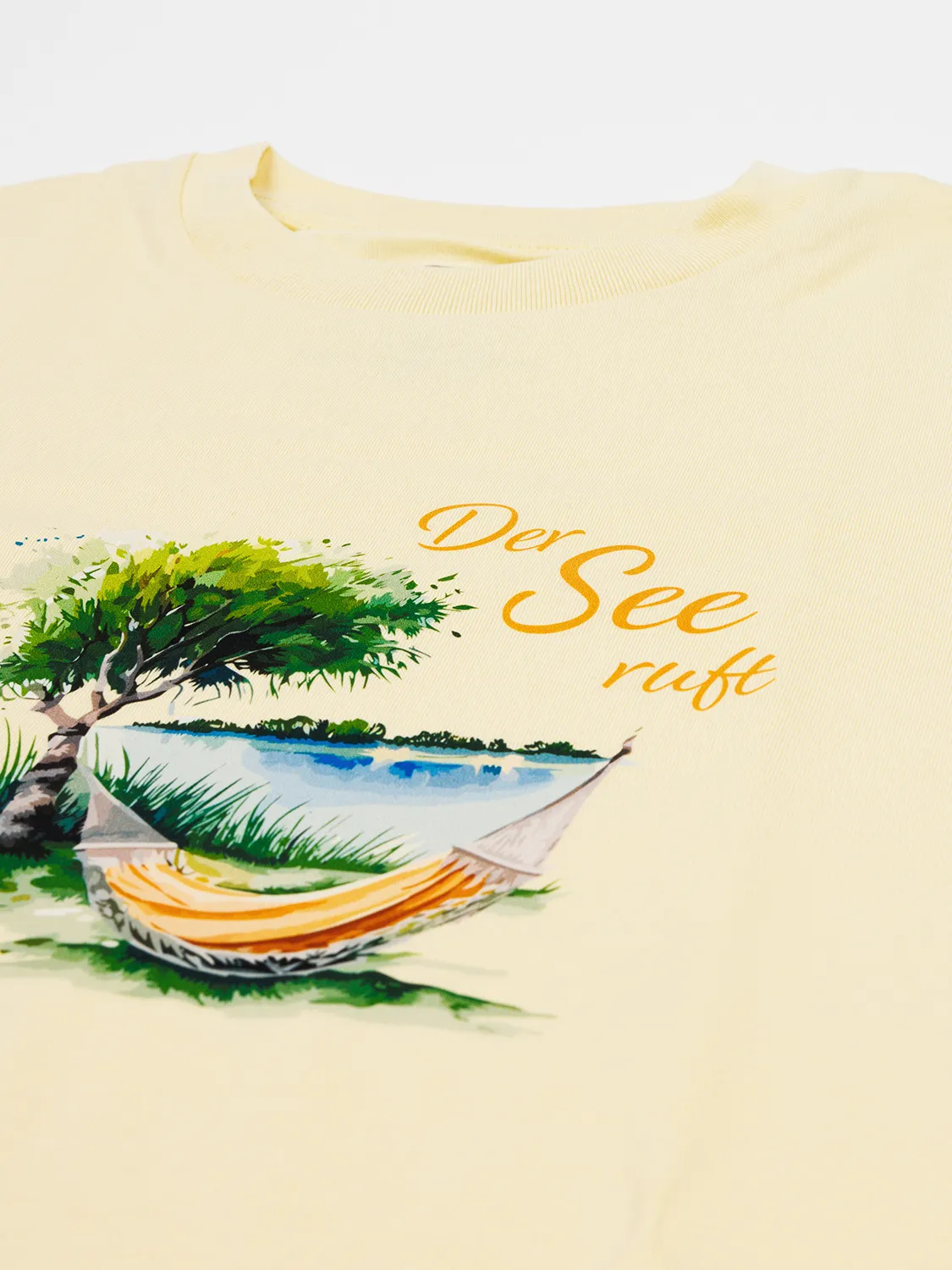 Dieses nachhaltige T-Shirt für Kinder überzeugt durch ein süßes Motiv mit der Aufschrift „Der See ruft“ und weiche Bio-Baumwolle.