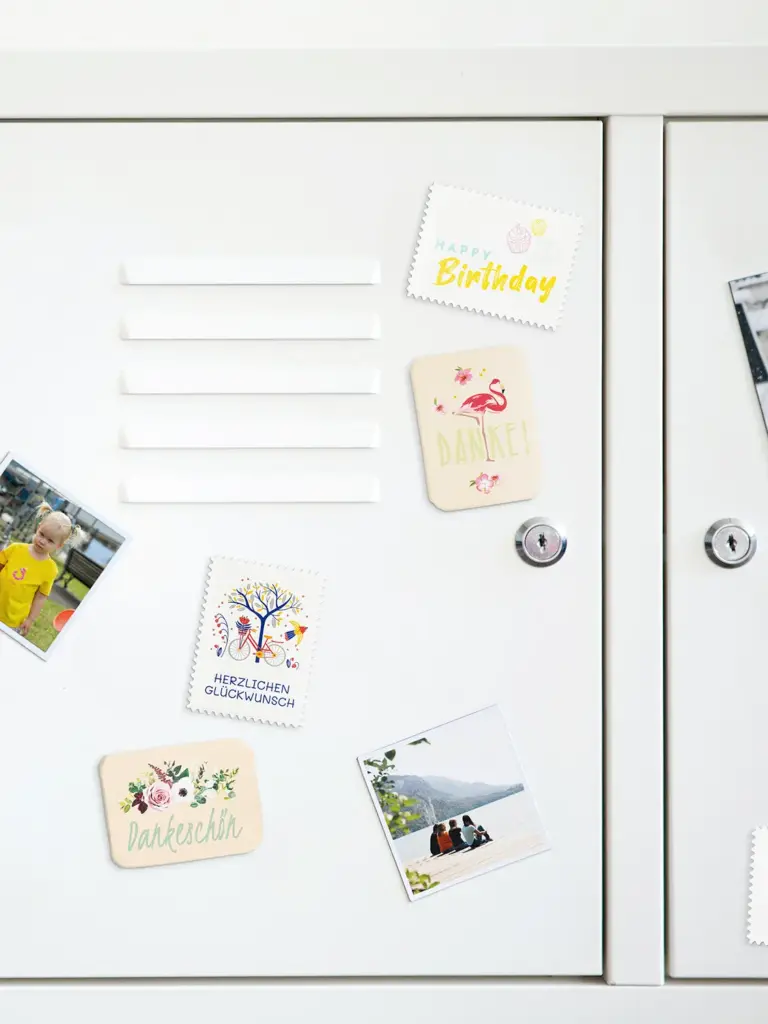 Dank der Aufschrift „Happy Birthday“ eignet sich dieser Magnet im Briefmarken-Design hervorragend als Geburtstagsgeschenk.