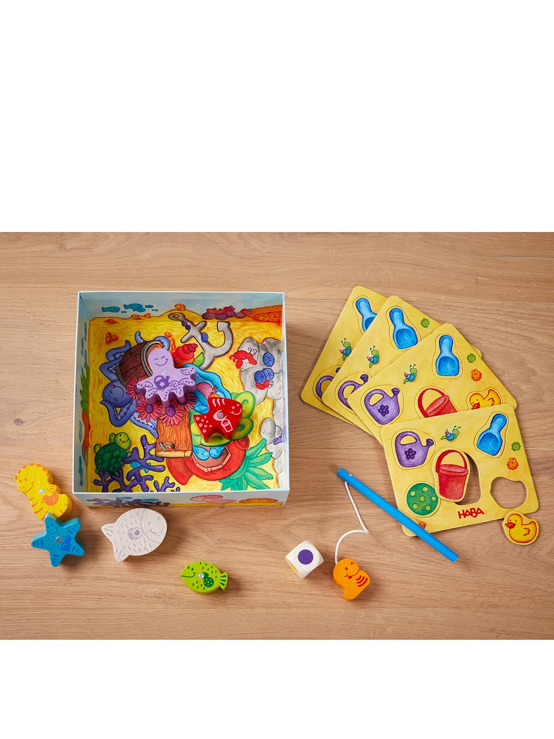 Im freien Spiel beschäftigen sich die Kinder mit der Angel, dem Aquarium sowie den lustigen Meeresbewohnern. Im Regelspiel ist es die Aufgabe der Kinder, einen Fisch in der entsprechenden Würfelfarbe zu angeln. Gelingt das, bekommt das Kind vom Fisch ein Spielzeug geschenkt, das es dann in seine Ablage puzzeln darf. Wer ist der beste Angler und hat als Erster alle Spielzeuge gesammelt?