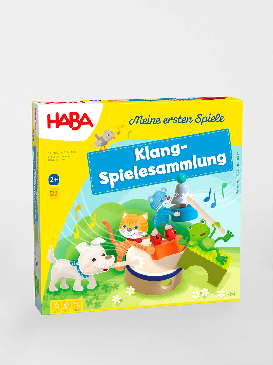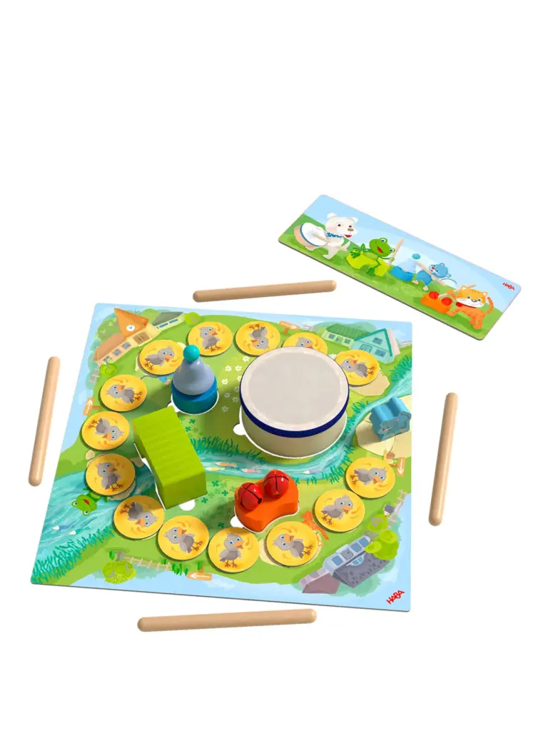 Mia Maus, Henri Hund, Freddy Frosch und Kitty Katze animieren Kleinkinder ab 2 Jahren dabei, Glocke, Trommel, Ratterbrücke und Schellen erklingen zu lassen. Die nachhaltige HABA Klang-Spielesammlung hält dazu eine Mitmach-Geschichte und 10 verschiedene Spiele mit über 20 Holzteilen bereit.