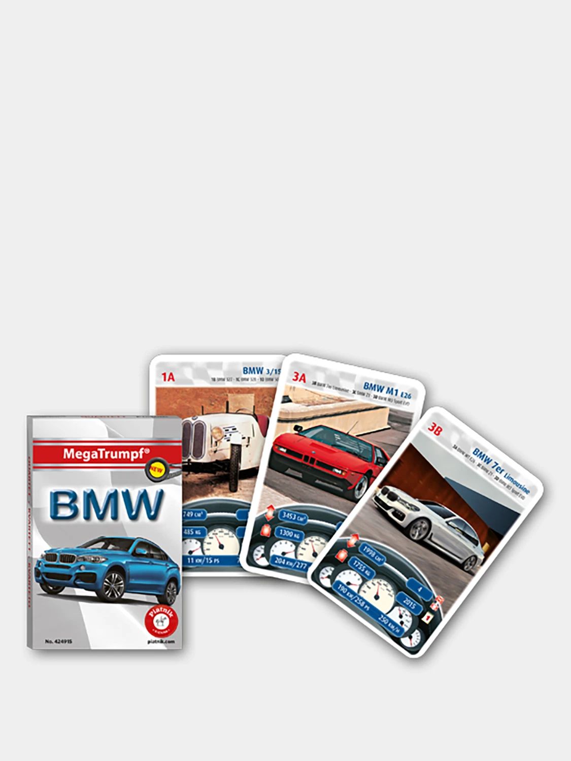 Egal ob als klassisches Quartett oder in der Megatrumpf® Variante: Dank der vielen technischen Details zu den unterschiedlichen Fahrzeugen, sorgt das BMW-Kartenspiel von Piatnik für Begeisterung bei Auto-Fans.