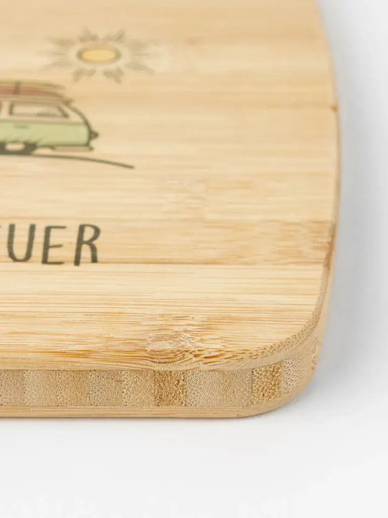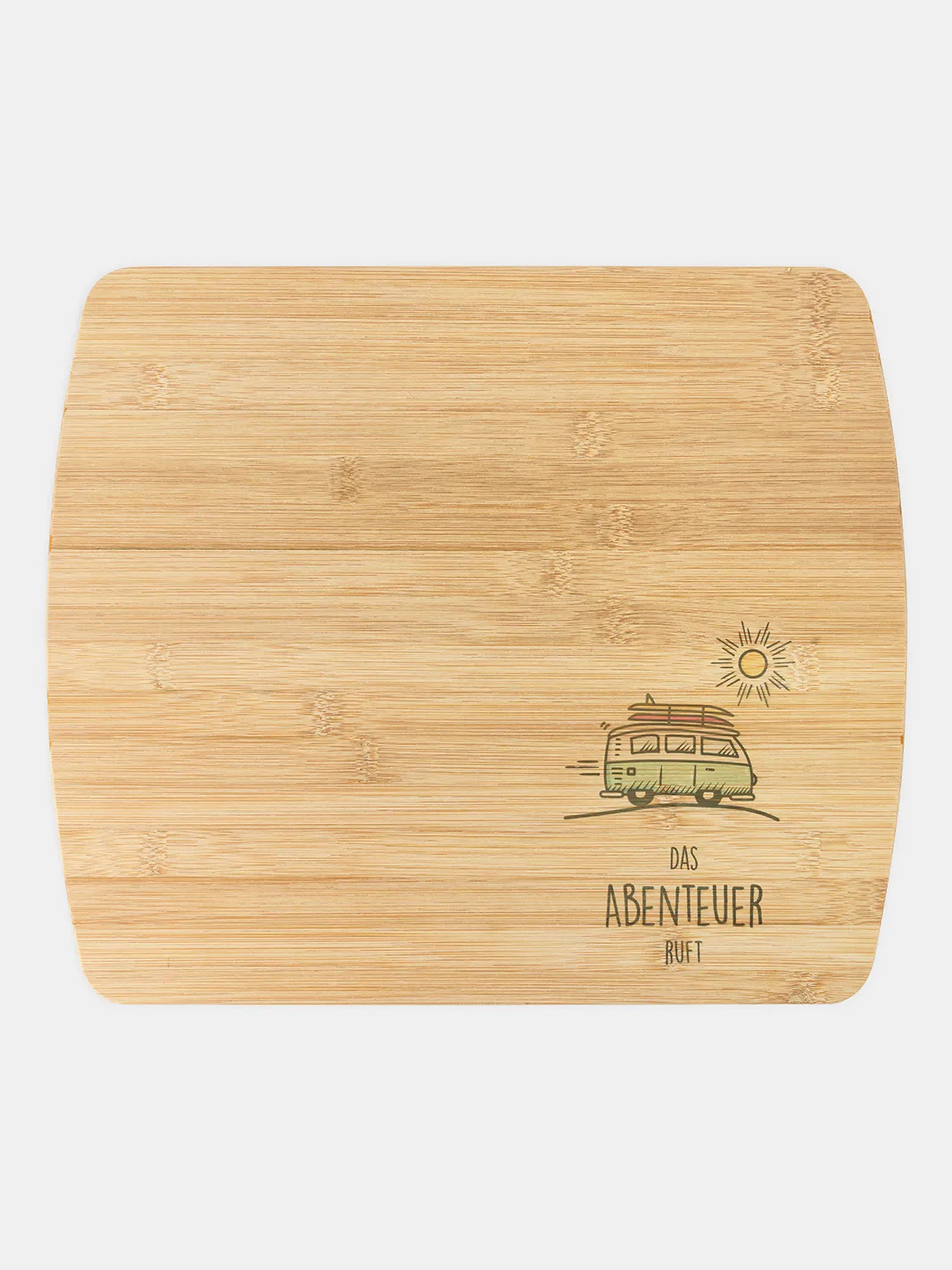 Eigenschaften: Hochwertige und langlebige Bambus-Schneidefläche, Aufdruck „Das Abenteuer ruft“