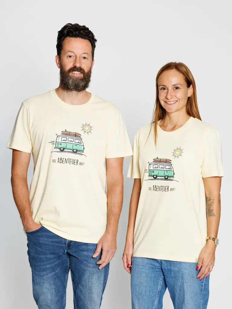 Das coole Vanlife Motiv mit der Aufschrift „Das Abenteuer ruft“ macht dieses nachhaltige T-Shirt zu einem lässigen Hingucker. Dank weichem Single Jersey aus Bio-Baumwolle ist das gerade geschnittene Oberteil äußerst angenehm zu tragen.